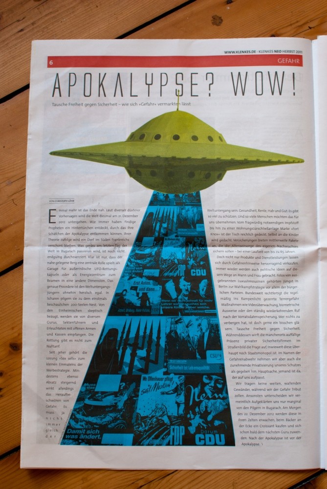 Doch nicht nur Produkte und Dienstleistungen lassen sich durch Gefahrenhinweise hervorragend verkaufen. Immer wieder werden auch politische Ideen auf diesem Wege an Mann und Frau gebracht. Fotos von ausgebrannten Luxuslimousinen gehörten jüngst in Berlin zur Wahlkampfstrategie vor allem der bürgerlichen Parteien. Bundesweit rechtfertigt die regelmäßig ins Rampenlicht gezerrte Terrorgefahr Maßnahmen wie Videoüberwachung, biometrische Ausweise oder den ständig wiederkehrenden Ruf nach der Vorratsdatenspeicherung. Wer nichts zu verbergen hat, ist doch gerne ein bisschen gläsern. Tausche Freiheit gegen Sicherheit. Währenddessen wirft die mancherorts auffällige Präsenz privater Sicherheitsfirmen im Straßenbild die Frage auf, inwieweit diese überhaupt noch Staatsmonopol ist. Im Namen der Gefahrenabwehr nehmen wir aber auch die zunehmende Privatisierung unseres Schutzes als gegeben hin. Hauptsache, jemand ist da, der auf uns aufpasst.